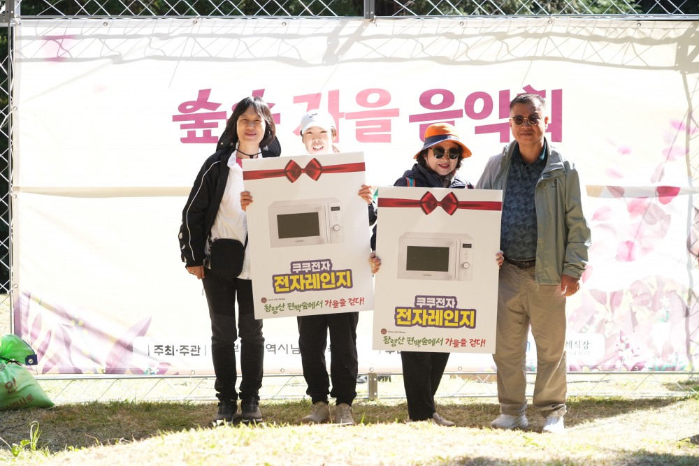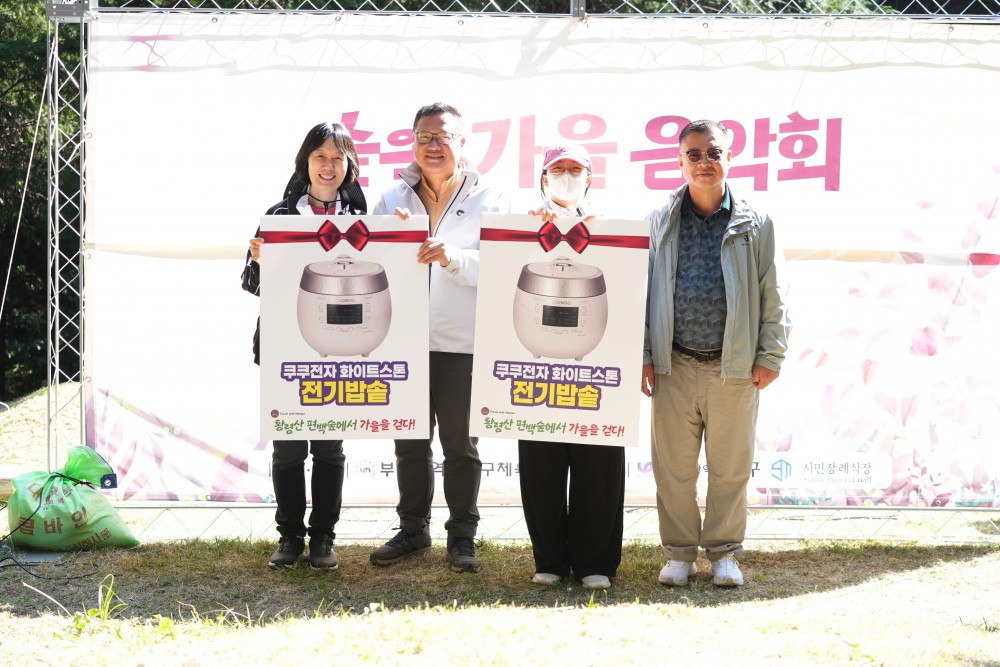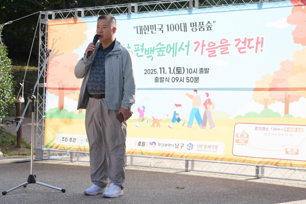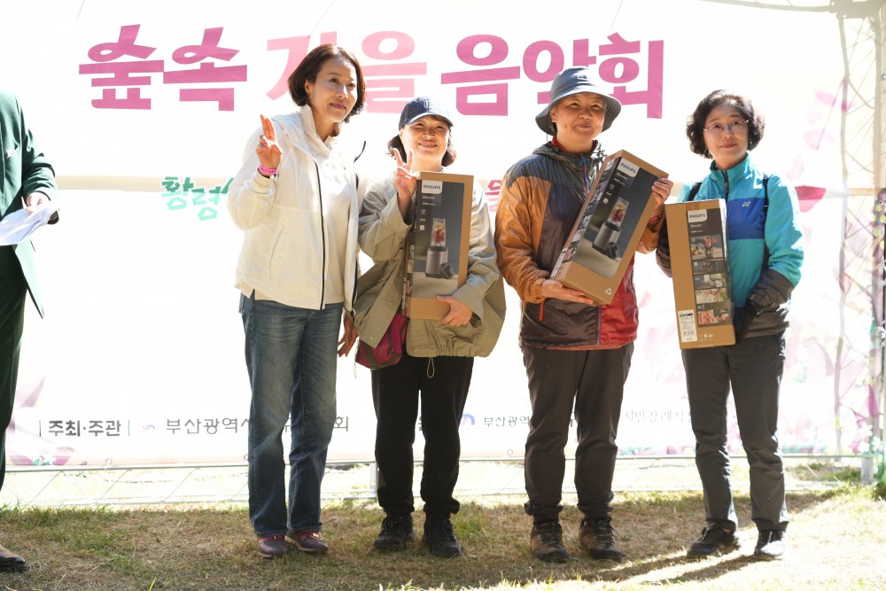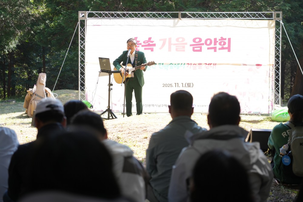 ●내용: 11월 1일(토) 황령산유원지 생태숲에서 '황령산 편백숲에서 가을을 걷다'행사가 개최되었습니다. 참가자들은 황령산유원지 생태숲에서 바람고개를 거쳐 편백숲 백향정까지 이어지는 약 1.6km의 아름다운 편백숲 길을 걸으며 늦가을 정취를 만끽했습니다. 도착지 편백숲 백향정에서는 ‘숲속 음악회’가 열려 참가자들이 피톤치드 가득한 숲속에서 아름다운 선율과 함께 진정한 힐링의 시간을 즐겼습니다. 음악회가 끝난 후에는 행운권 추첨을 통해 다양한 경품이 전달되며 훈훈한 분위기 속에 마무리됐습니다.