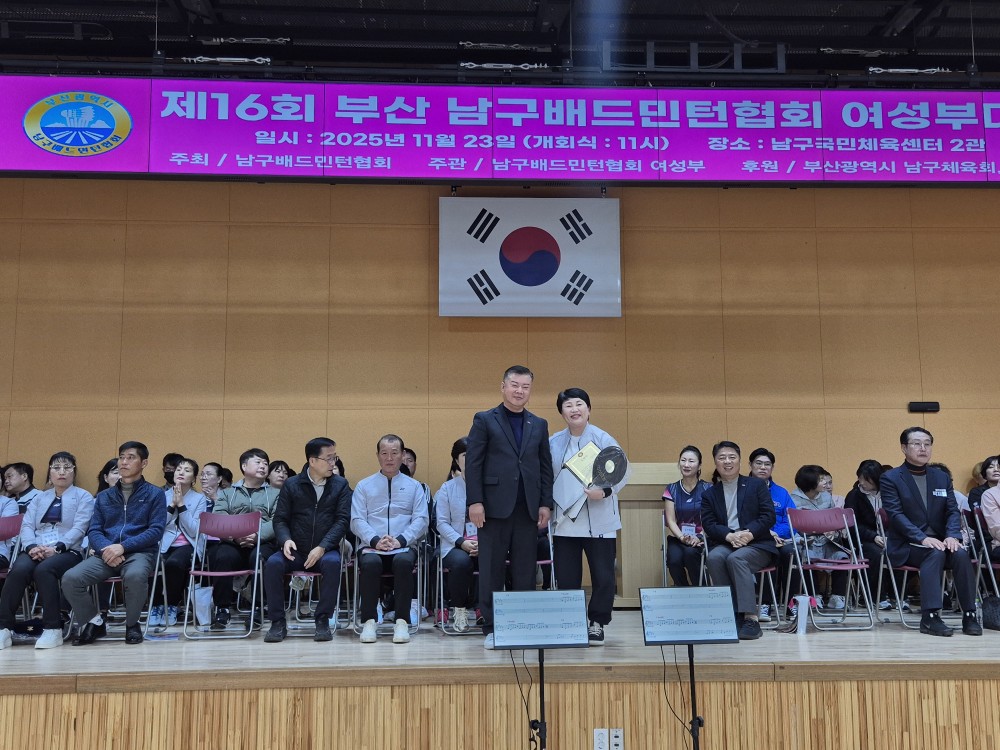 ●내용: 11월 23일(일) 남구국민체육센터 2관 실내체육관에서 '제16회 부산광역시남구배드민턴협회 여성부 대회'가 개최되었습니다. 이날 정춘식 남구체육회장님과 오은택 남구청장님 등 많은 내빈들이 참석하여 선수들을 격려해 주셨습니다. 배드민턴 여성 동호인들의 뜨거운 열정이 느껴지는 대회였습니다.