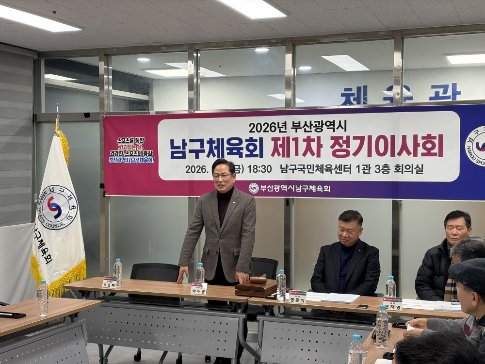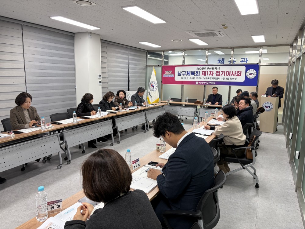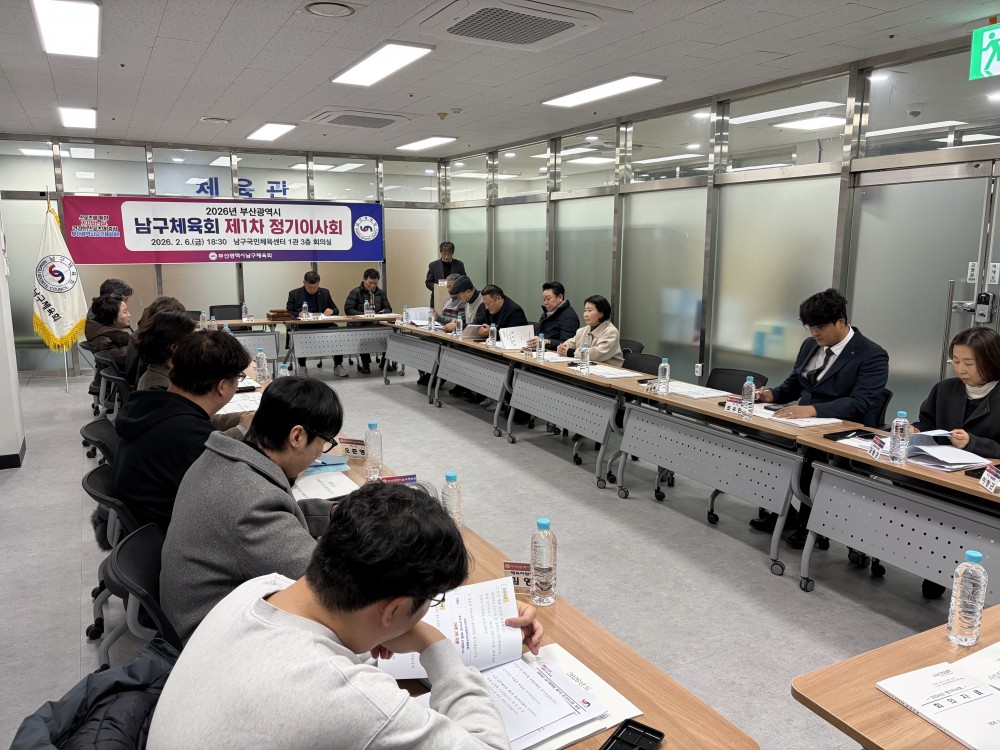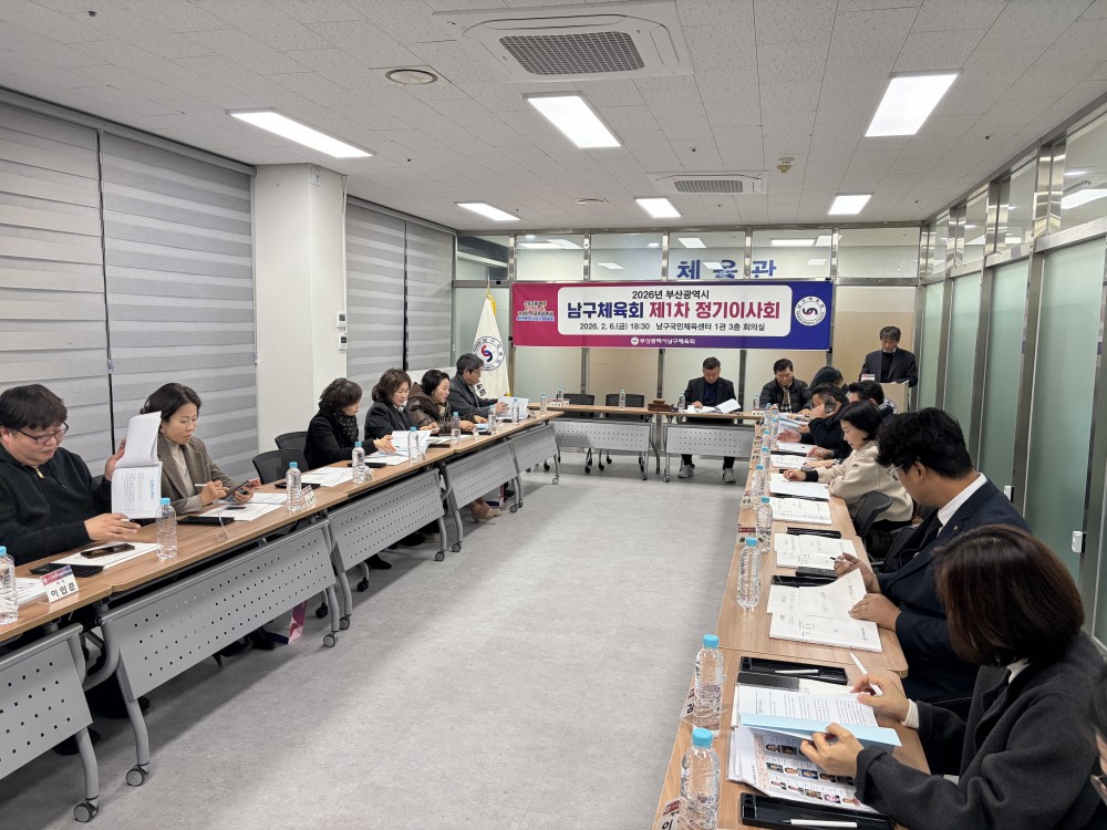 ●내용: 2월 6일 남구국민체육센터 1관 3층 남구체육회 회의실에서 '2026년 부산광역시남구체육회 제1차 정기이사회'가 열렸습니다. 정춘식 남구체육회장님, 박수영 국회의원님, 서성부 남구의회의장님을 비롯하여 남구체육회 이사님, 남구청 교육체육과 직원들도 참석해주셨습니다. 남구체육회 운영 및 발전을 위해 힘써주시는 모든 분들에게 감사하다는 말씀을 전합니다.