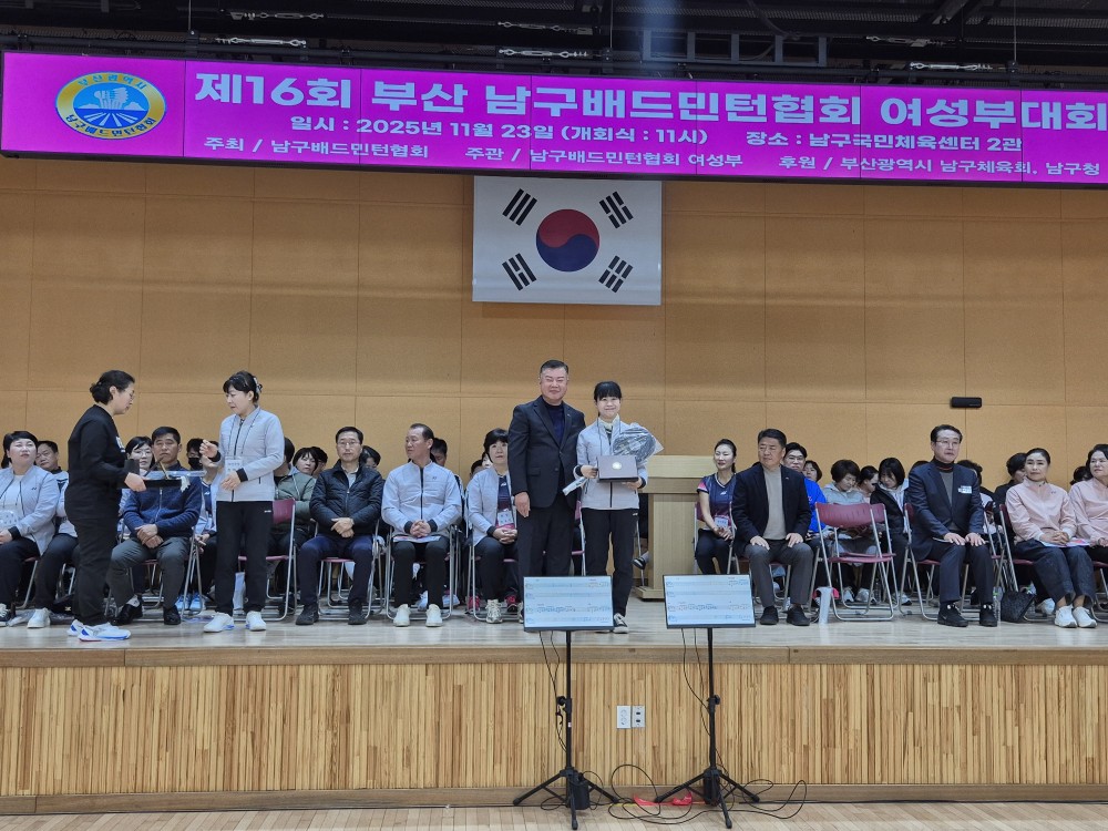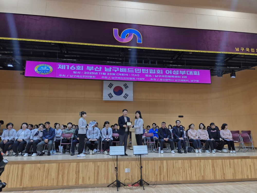 ●내용: 11월 23일(일) 남구국민체육센터 2관 실내체육관에서 '제16회 부산광역시남구배드민턴협회 여성부 대회'가 개최되었습니다. 이날 정춘식 남구체육회장님과 오은택 남구청장님 등 많은 내빈들이 참석하여 선수들을 격려해 주셨습니다. 배드민턴 여성 동호인들의 뜨거운 열정이 느껴지는 대회였습니다.
