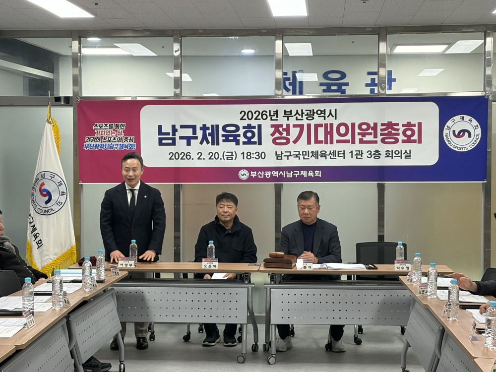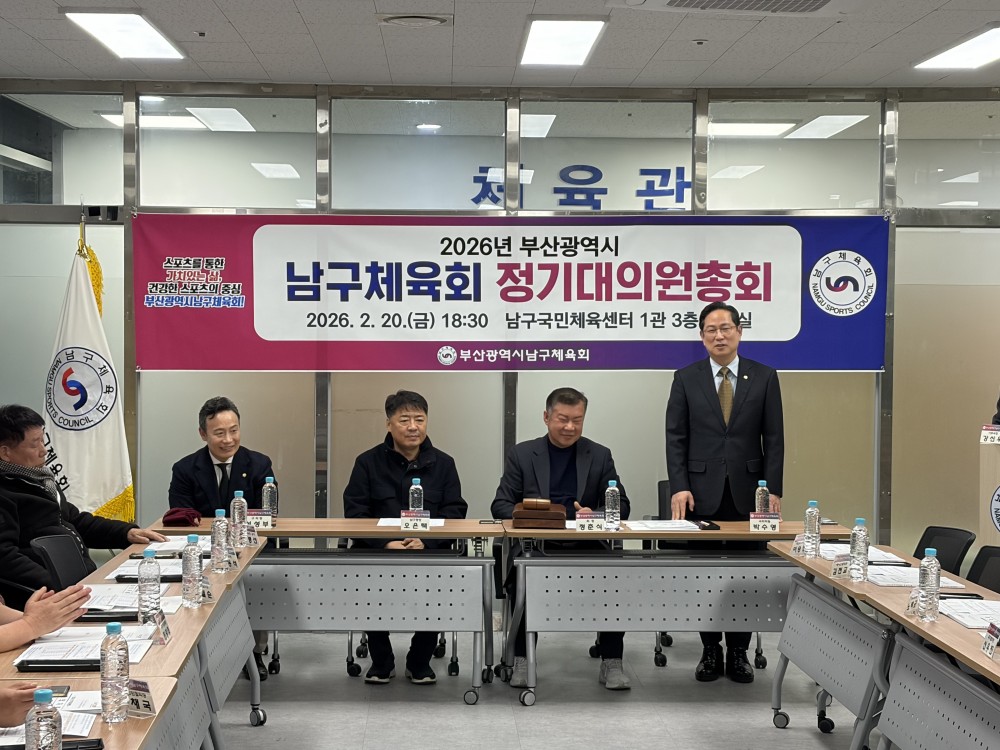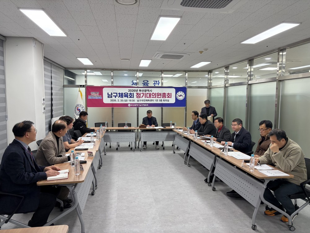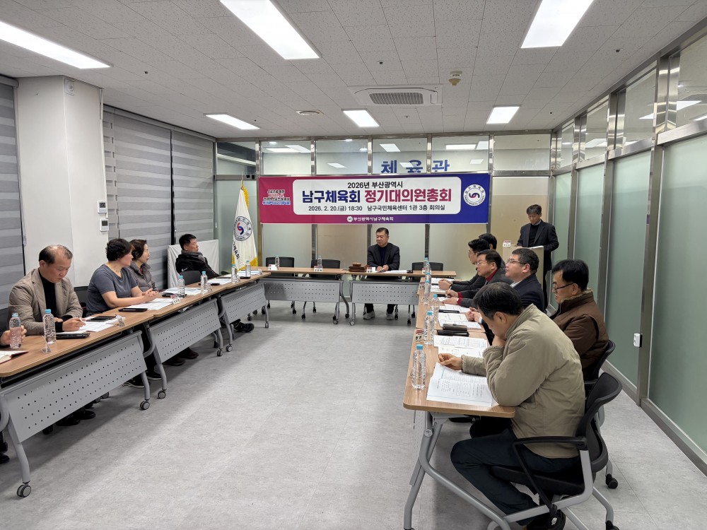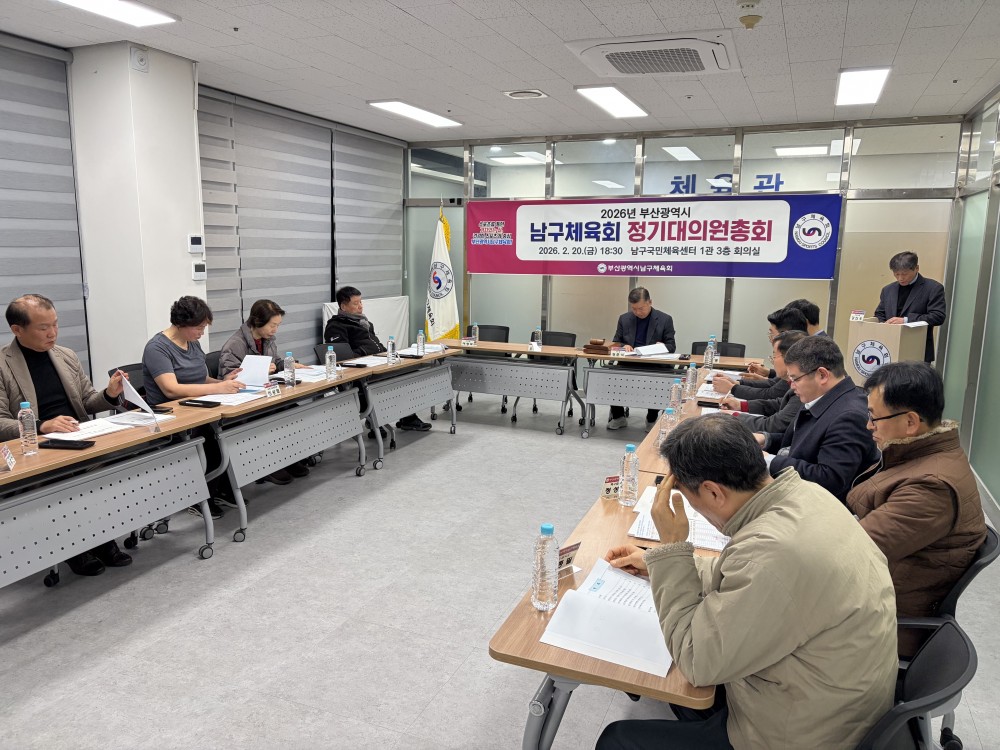 ●내용: 2월 20일 남구국민체육센터 1관 3층 남구체육회 회의실에서 '2026년 부산광역시남구체육회 정기대의원총회'가 열렸습니다. 이날 정춘식 남구체육회장님을 비롯하여 남구체육회 정회원종목단체 협회장님들이 참석해주셨습니다. 남구체육 운영 및 발전을 위해 힘써주시는 남구체육회 정회원종목단체 협회장님들에게 감사하다는 말씀을 전합니다.